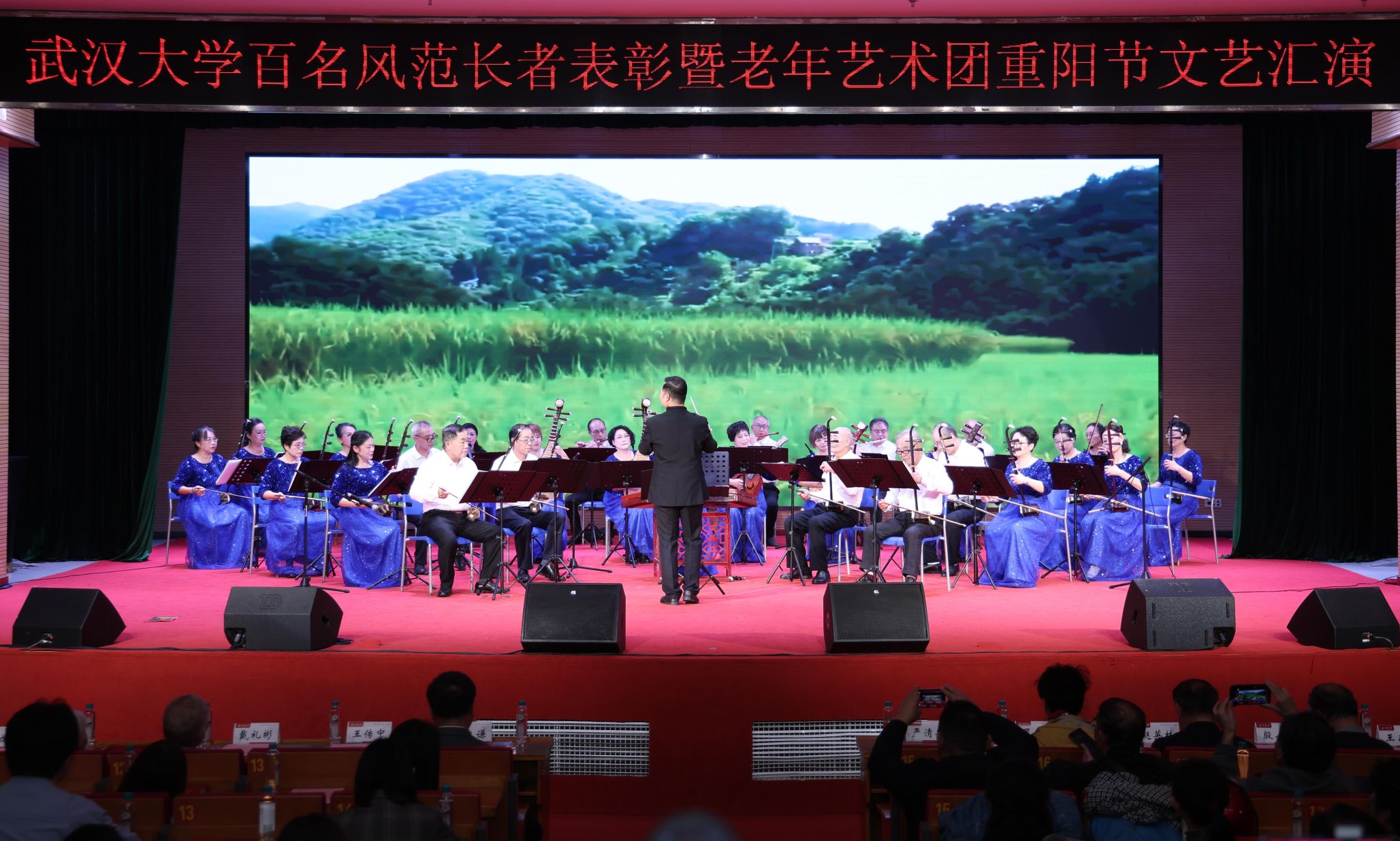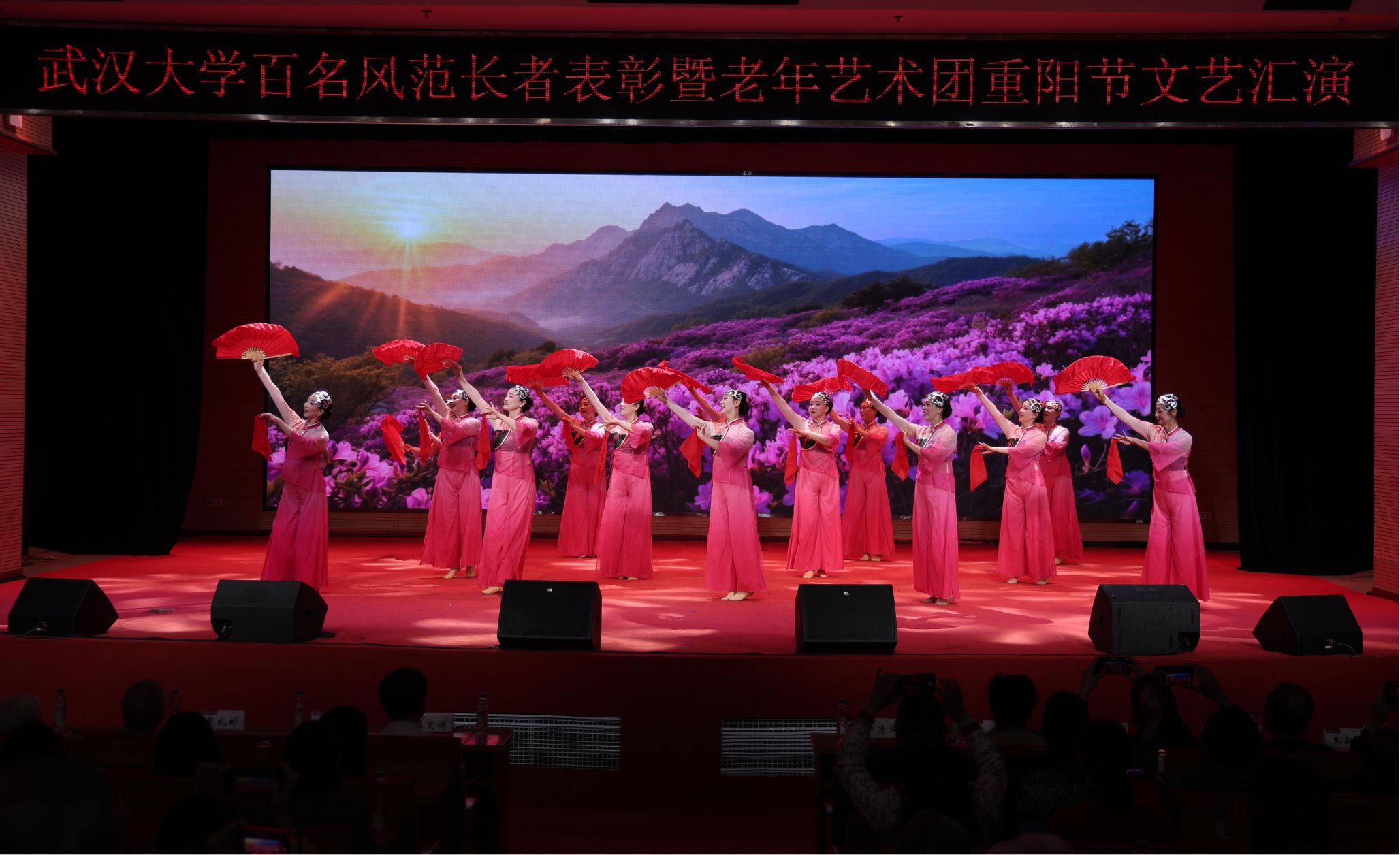 表彰环节结束后,武汉大学老年艺术团带来了一场精彩纷呈的文艺演出。演出在民乐合奏《在希望的田野上》中拉开序幕,随后《万疆》《游击队歌》《闪亮的日子》等节目轮番上演,舞蹈《沂蒙的女儿》、模特秀《歌里画里的祖国》、合唱《思念》等节目更是将现场气氛推向高潮。老同志们以悠扬的旋律和优雅的演绎,展现了新时代珞珈银龄的风采与活力,赢得了现场观众的阵阵掌声。