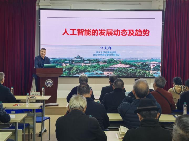 党的二十届四中全会提出,加快高水平科技自立自强,引领发展新质生产力。为了全面理解当前我国人工智能发展状况,11月12日上午,武汉大学关心下一代工作委员会(以下简称校关工委)特邀请国家级教学名师、曾任校计算机学院院长的何炎祥教授作《人工智能的发展动态及趋势》专题报告。校关工委负责人、二级单位关工委副主任参加会议。离退休工作处副处长吴仪主持会议。