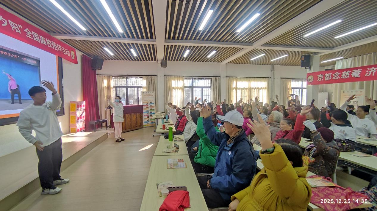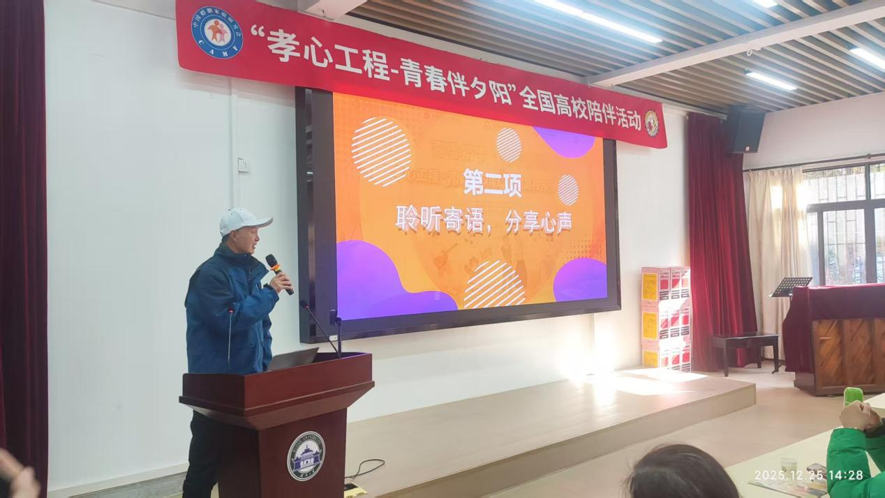2025年12月25日下午,武汉大学文理学部离退休教职工活动中心113教室内笑语声声、温情满满。离退休工作处联合学校青年志愿者行动促进中心,共同举办“孝心工程——青春伴夕阳”高校陪伴实践活动。活动以弘扬“敬老、爱老、助老、孝老”传统美德为宗旨,通过丰富多彩的互动环节,搭建起青年学子与离退休教职工情感交流的桥梁,让孝亲敬老的校园文化在代际陪伴中绵延传承。