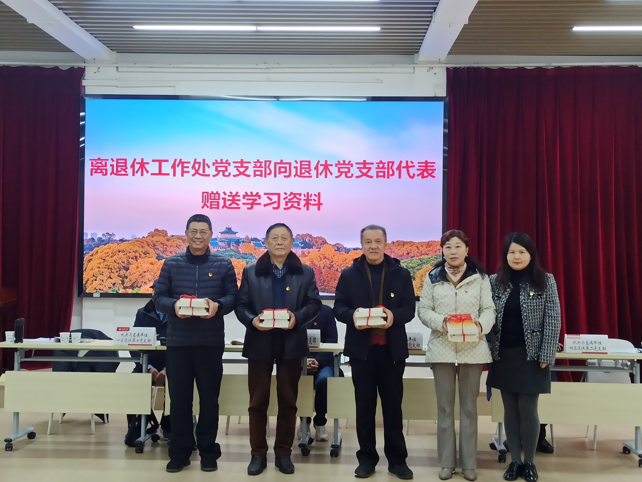 在与退休支部的跨支部研讨活动中,全体党员集体重温入党誓词,机关党委副书记、离退工作处副处长吴仪同志代表离退休工作处党支部向四个退休党支部赠送学习资料。