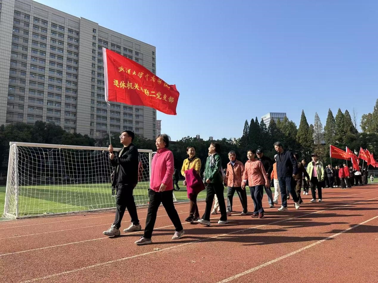 在舒缓的音乐中,全体老同志整齐列队,共同演练“八段锦”。他们神情专注,动作舒展,一招一式间尽显从容。热身结束后,各支部方阵在退休支部书记的旗引与志愿者的陪伴下,依次出发。行进中,老同志们边走边聊,时而驻足合影,时而遥指秋景,欢声笑语萦绕操场。行至主席台前,各支部精神抖擞,高呼独具特色的口号,声浪迭起,气氛热烈。志愿者穿梭其间,或贴心搀扶,或帮助拍照,细微之处尽显关怀。