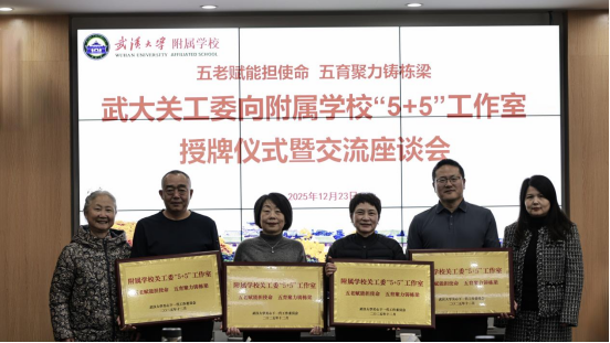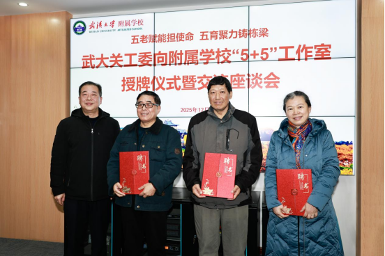 寒冬腊月暖意浓,薪火相传育新苗。12月23日下午2:30,武汉大学关工委向附属学校“5+5”工作室授牌仪式暨交流座谈会在附属中学5楼会议室隆重举行。此次活动聚焦“五老赋能担使命 五育聚力铸栋梁”,深度对接武汉大学五老资源优势与附属学校改革发展需求,这是武汉大学附属中小学落实立德树人根本任务、探索构建家校社协同育人模式的创新实践。