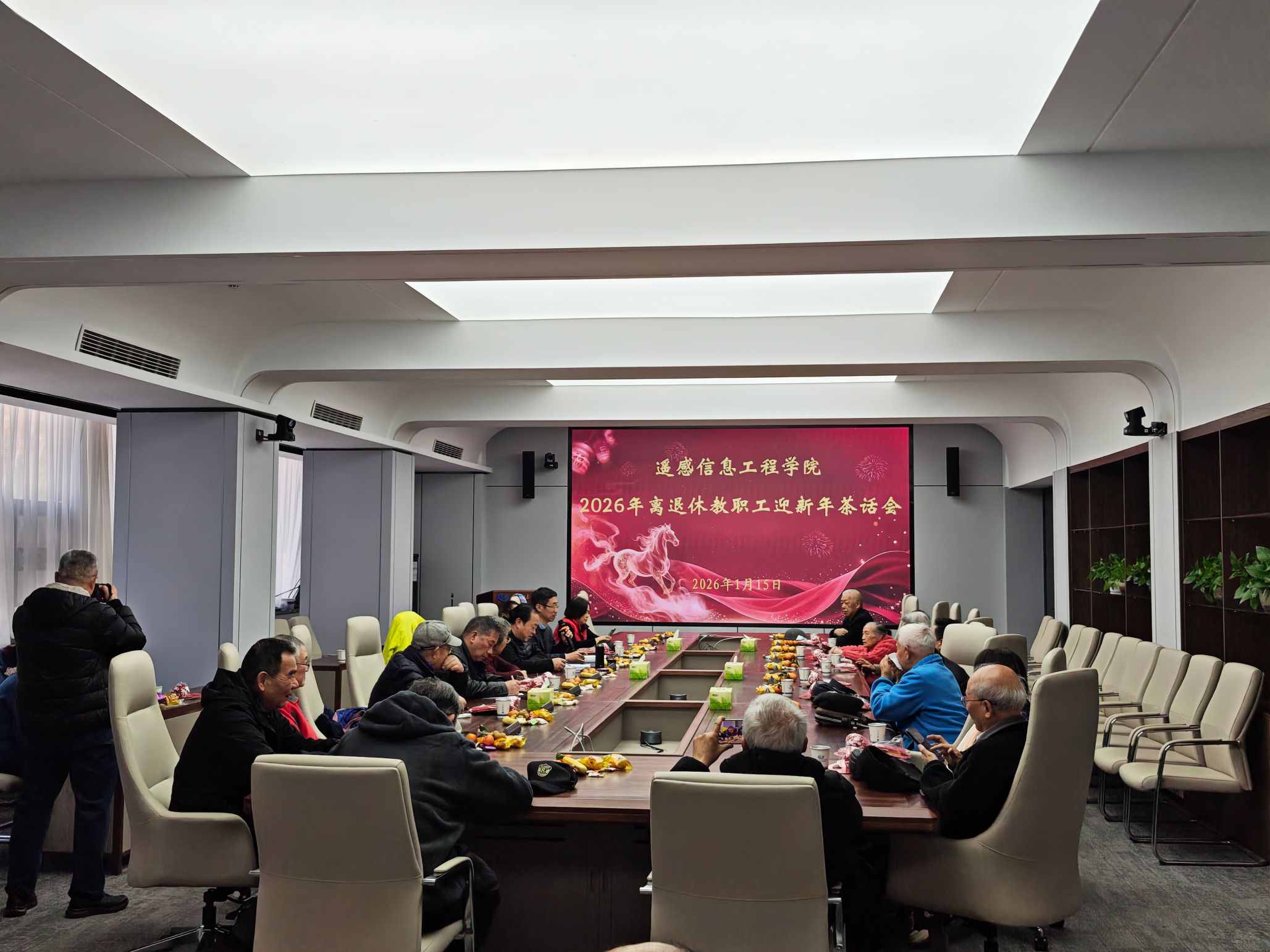 岁序常易,华章日新。为传承敬老爱老传统,凝聚离退休教职工力量,2026年1月15日,遥感信息工程学院举行离退休教职工2026年迎新年茶话会。学院党委书记、院长与离退休教职工们欢聚一堂,共叙往昔情谊,共话学院发展,共迎新春佳节。茶话会由学院党委副书记吴泽娟主持,现场暖意融融、笑语盈盈,洋溢着浓浓的节日氛围。